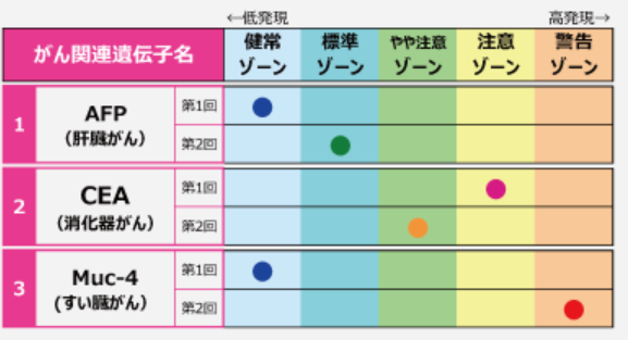 9つの遺伝子(男性:8部位、女性:11部位)ごとに5段階でリスクを評価します。 癌の部位ごとに選定された遺伝子の発現量を測定し、現時点での生活習慣に起因する癌細胞の存在リスク及び、癌の何歩手前にいるかを予測・評価することが可能で、治療ではなく予防を目的とした画期的な検査です。改善した後の効果の確認も可能です。