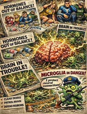 この4つのホルモンのバランスが崩れると、脳の不調が引き起こされます。ホルモンバランスの異常の影響を特に受けるのが、ミクログリア(脳の免疫細胞)です。