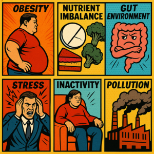• 腸内細菌叢の乱れ: グルテン不耐症や多量飲酒、ストレスなどは腸管バリアを破壊し、有害物質を血中に流入させ、全身の慢性炎症を誘発します。