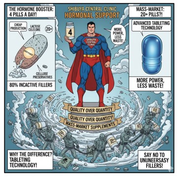 渋谷セントラルクリニックが提唱するホルモンブースターは、1日4錠を基本としています。しかし、その内容を市販のサプリメントで網羅しようとすると、ネイチャーメイドやDHCなどの製品を20錠以上飲んでも足りないというのが現実です。
