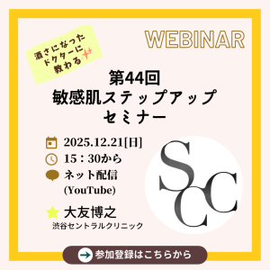 毎月の「敏感肌ステップアップセミナー」ではこれらの疾患でお悩みの方に、ご自身も酒さで悩んでまいりましたドクター大友が患者さまの視点に立ってお話をさせて頂きます。
